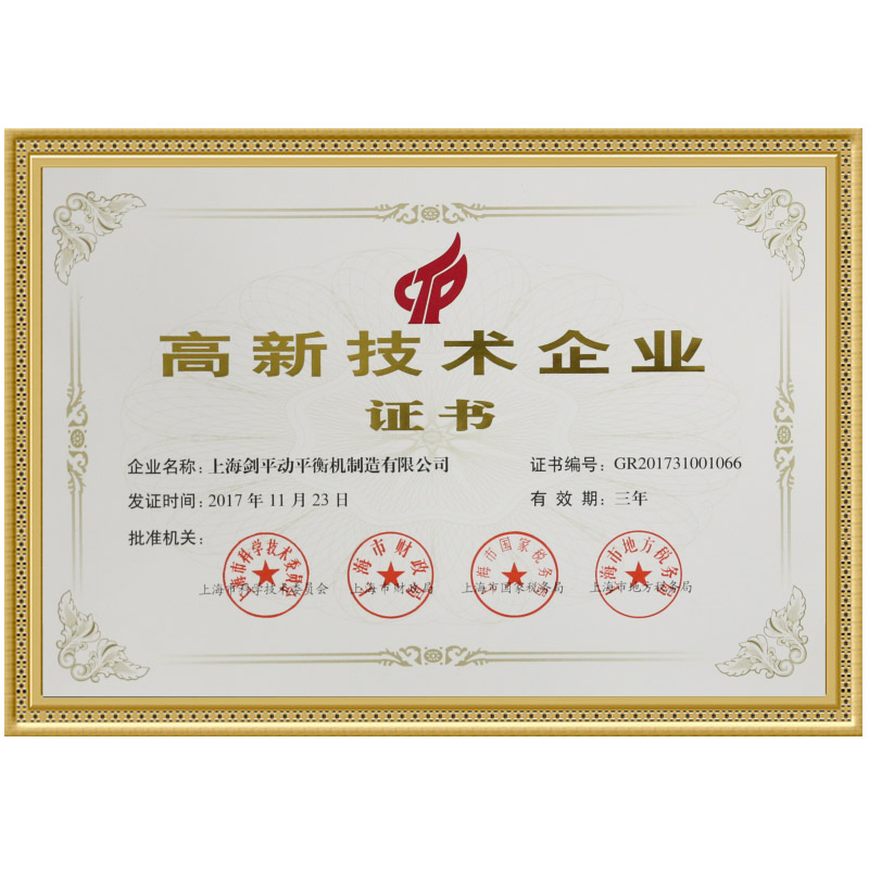 近日,國內(nèi)動(dòng)平衡機(jī)制造商上海劍平獲得高新技術(shù)企業(yè)認(rèn)證。